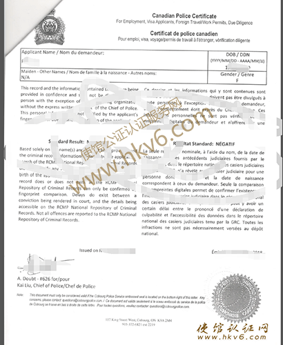 加拿大无犯罪证明公证书样本: