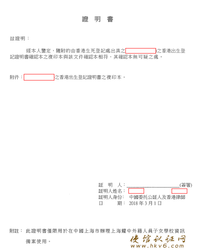 香港孩子出生纸公证用作在上海上学